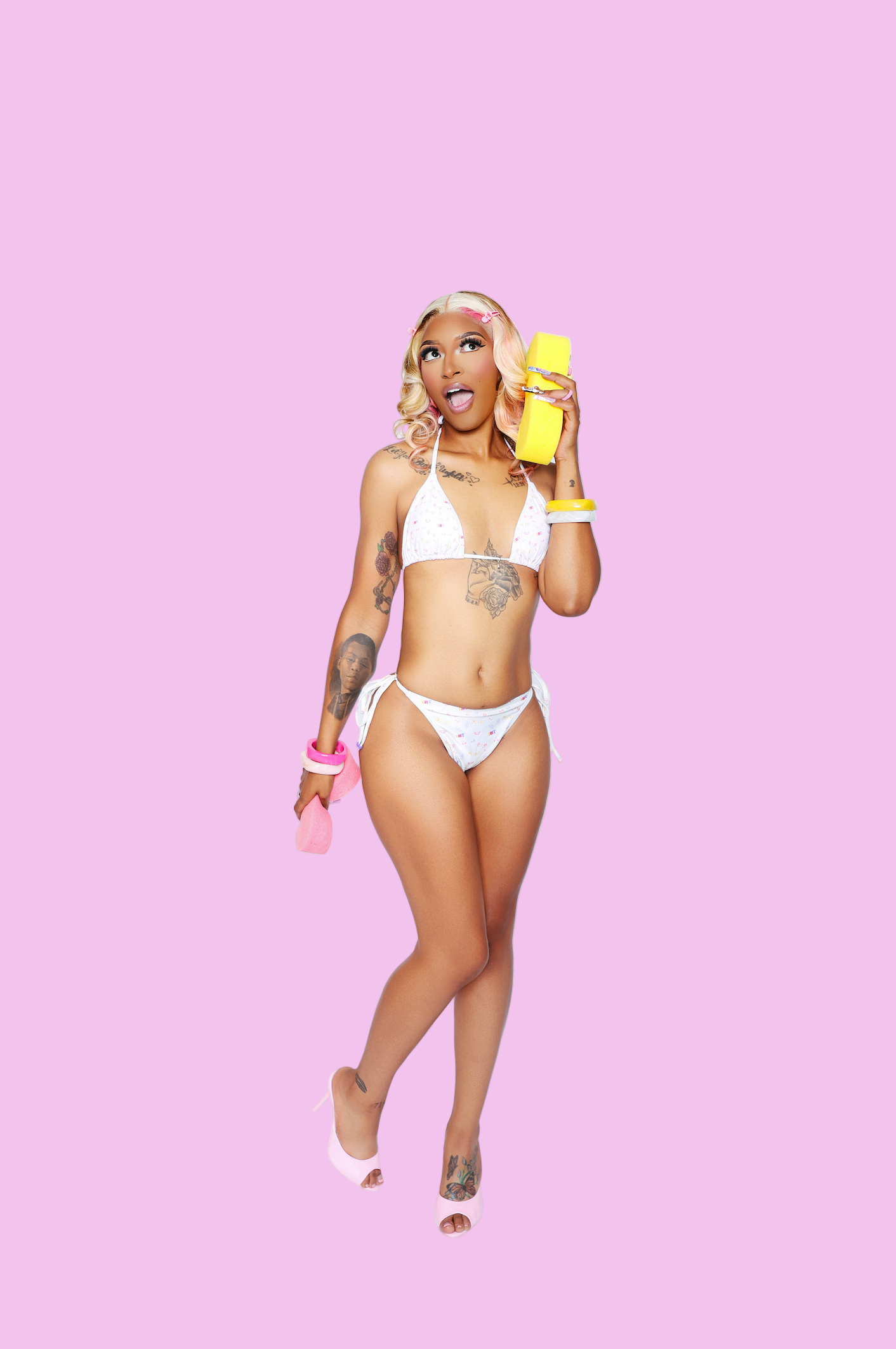 Itty Bitty Titty Print Bathing Suit. White padded Triangle Top with Multi. Colored Print with String Tie Ups. Each String has a different Color Bead. Colors includes Pink,Light Pink, Pink, Purple, White and Yellow.
